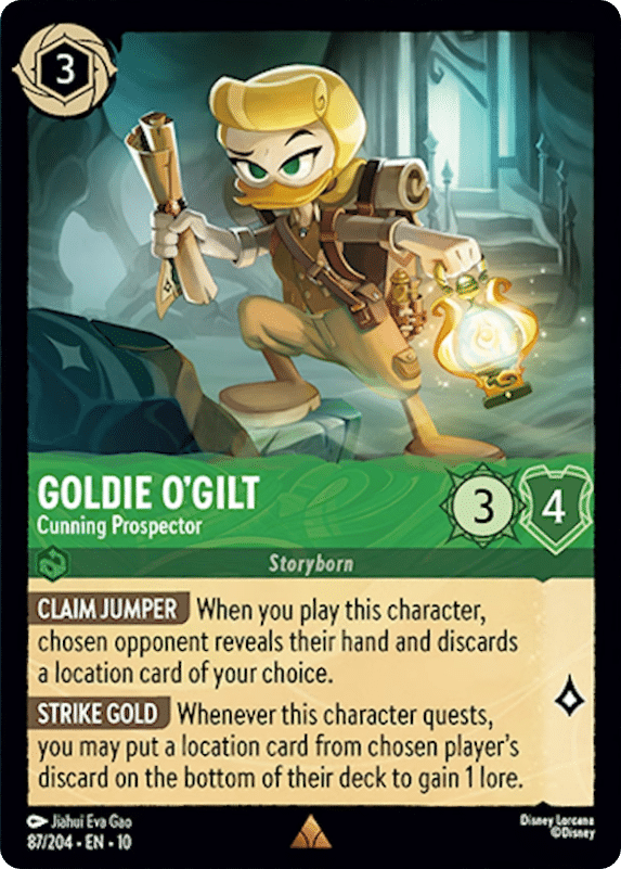 STRIKE GOLD: Whenever this character quests, you may put a location card from chosen player’s discard on the bottom of their deck to gain 1 lore.