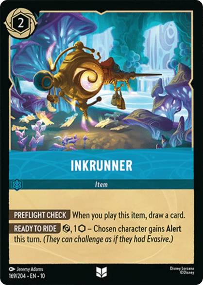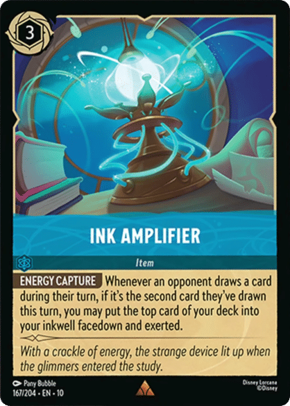 ENERGY CAPTURE: Whenever an opponent draws a card during their turn, if it’s the second card they’ve draw this turn, you may put the top card of your deck into your inkwell facedown and exerted.