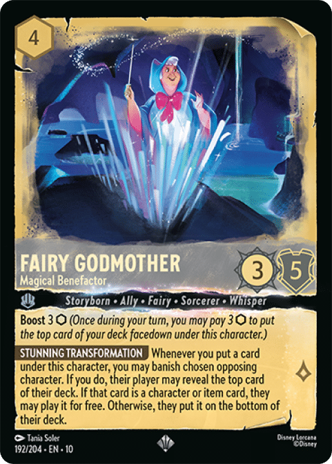 STUNNING TRANSFORMATION: Whenever you put a card under this character, you may banish chosen opposing character. If you do, their player may reveal the top card of their deck. If that card is a character or item card, they may play it for free. Otherwise, they put it on the bottom of their deck.
